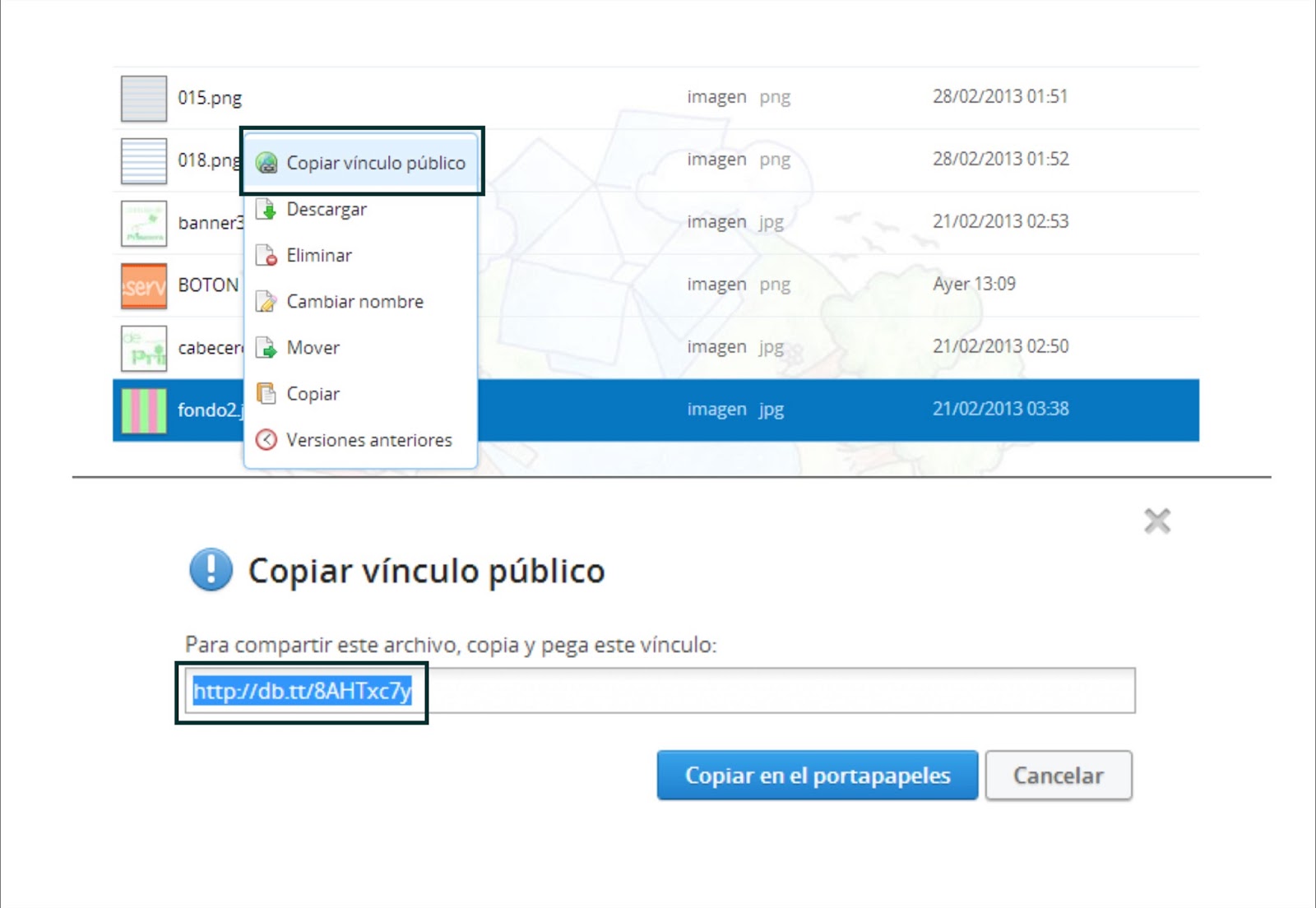 2.- Vamos a Dropbox y copiamos el enlace de nuestra imagen. Si no sabéis como hacerlo podéis verlo en Como compartir tus archivos con Dropbox (os cuento el jueves que viene).