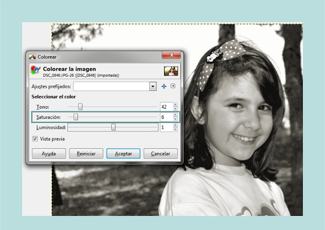 3.- Tocando la barra de Saturación, bajándola de nivel, los colores se pierden y conseguiremos una imagen en blanco y negro. GIMP tiene otra herramienta para conseguir este mismo resultado que os mostraré más adelante.