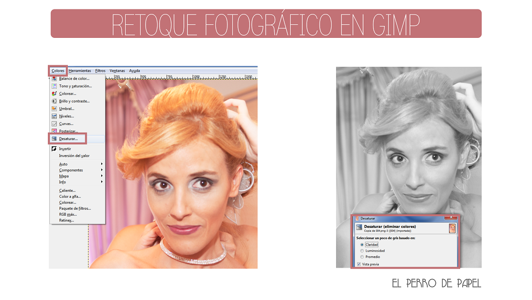 3.- Ahora vamos a pasar la fotografía de esta capa a blanco y negro con la herramienta desaturar. Ruta: Colores ---> Desaturar.