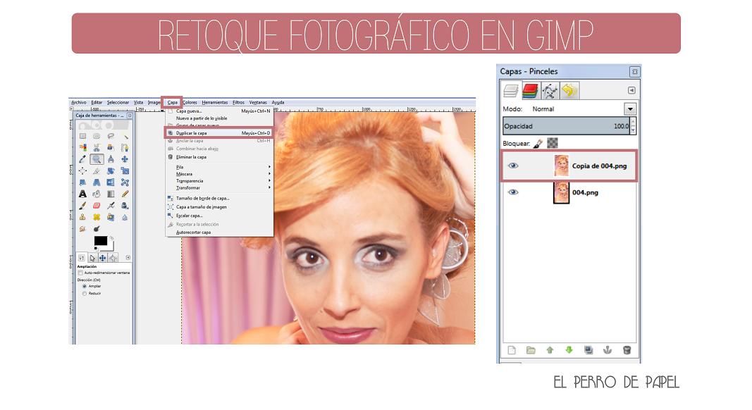2.- Lo primero que haremos será duplicar la capa. Para ello vamos a Capa ---> Duplicar capa. Y nos aseguramos de tener la nueva capa seleccionada en el panel de la derecha.