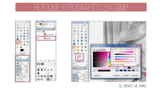 2.- Yo he aplicado color a la zona de los ojos, el collar y los colores de fondo. Podéis modificar la opacidad, tamaño y color de vuestro pincel en el panel de la izquierda hasta conseguir el efecto que buscáis.