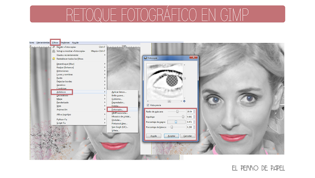 4.- Usaremos el filtro fotocopia. Los resultados de este filtro artístico dan mucho juego. En Vista Previa podemos modificar sus características. Yo he aumentado los negros para marcar más las líneas. Ruta: Filtros ---> Artísticos ---> Fotocopia.