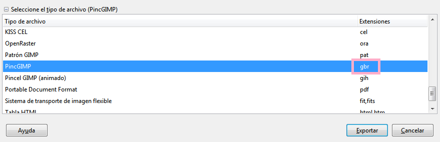 Y seleccionamos la extensión .gbr que es la predeterminada para los pinceles de GIMP.