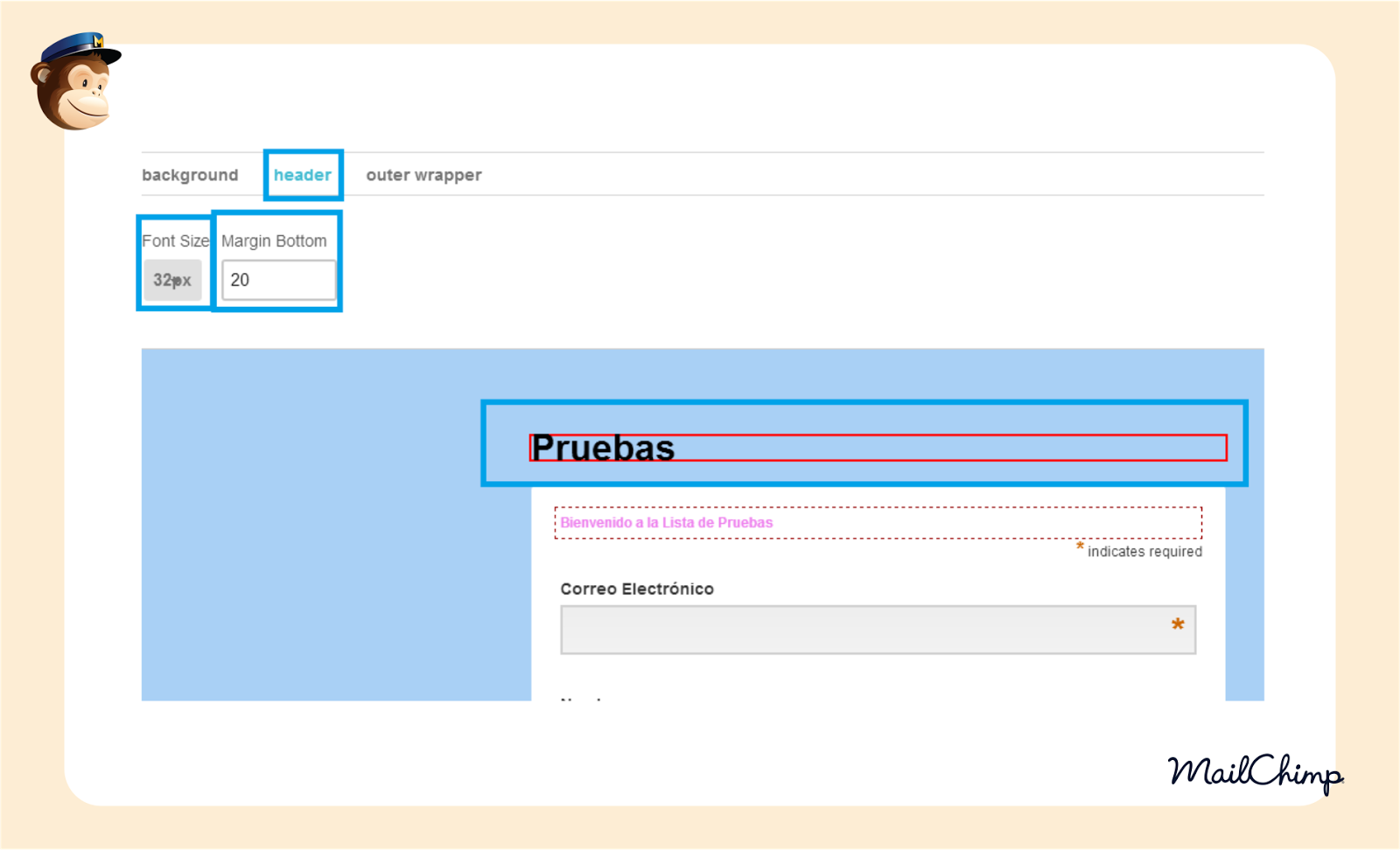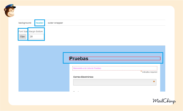 9.- en Header, podemos modificar el tamaño de letra (Font Size) y el espacio entre el cabecero y el formulario (Margin Bottom)