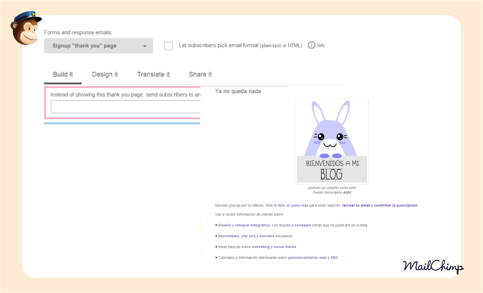 En el cuadro de texto podemos añadir una URL de una página web donde podemos agradecer de manera más extensa su confianza y recordarles los motivos de su suscripción y lo que recibirán en su email de registro.