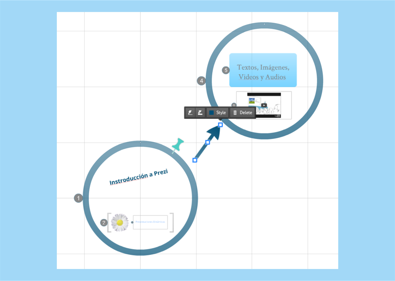 Como podéis ver, en la flecha no aparece ningún número, eso quiere decir que es un elemento meramente decorativo al que la cámara de Prezi no prestará mayor atención durante el recorrido marcado.
