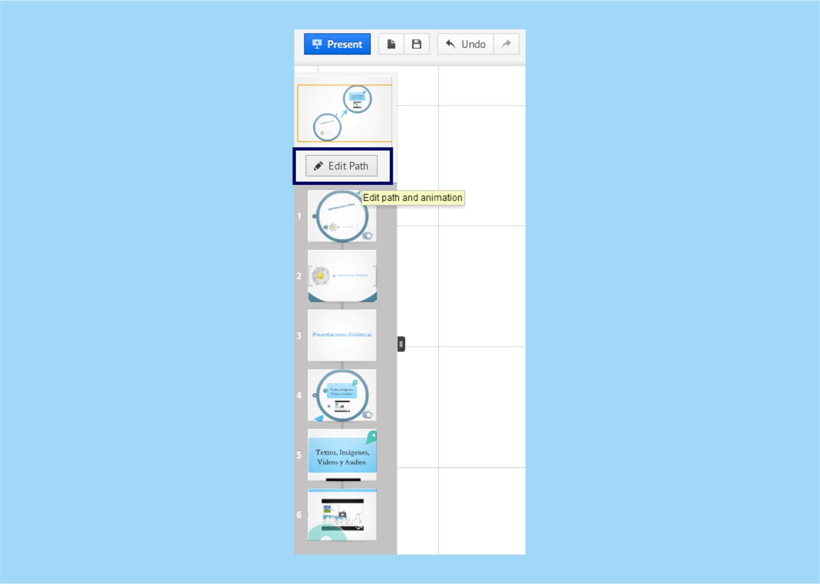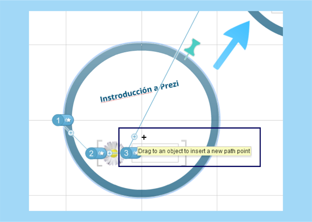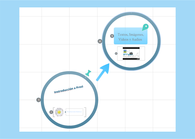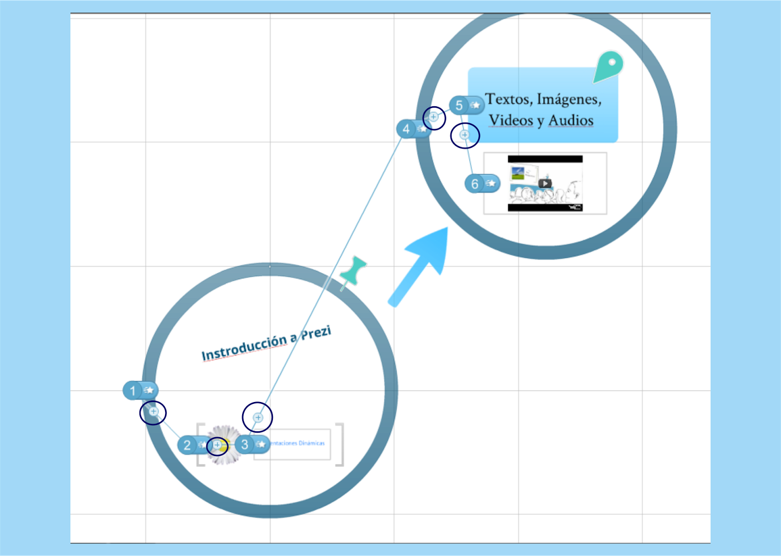 7.- Os aparecerá la ruta que seguirá la cámara marcada con una línea azul. Los números son los puntos en los que hemos indicado a Prezi que la cámara debe parar y enfocar.