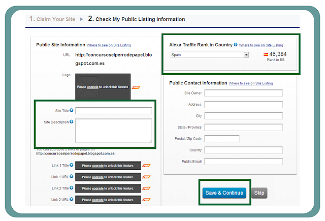Aquí es donde añadimos nuestro país, para aparecer en el ranking correctamente localizados. Y la información de contacto que queremos que aparezca cuando alguien busque el posicionamiento de nuestro blog en Alexa. Guardamos y continuamos.