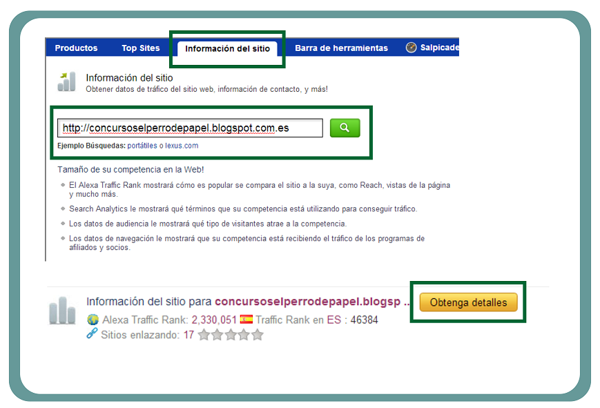 1.- En Información del Sitio buscamos nuestro Blog. En la siguiente pantalla, donde ya aparecerá nuestro ranking, seleccionamos Obtenga Detalles.