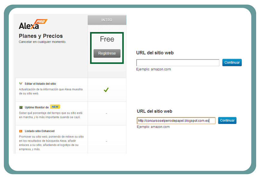 2.- Nos registramos en la versión Gratuita/Free. Añadimos la url de nuestro blog, incluyendo el http:// delante.