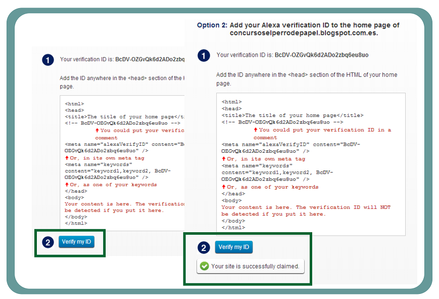 6.- Regresamos a Alexa y pinchamos en Verify my ID/Verificar mi ID. Si lo hemos hecho correctamente, Alexa detecta el código y te informará de que has reclamado tu Blog correctamente. Continuamos.