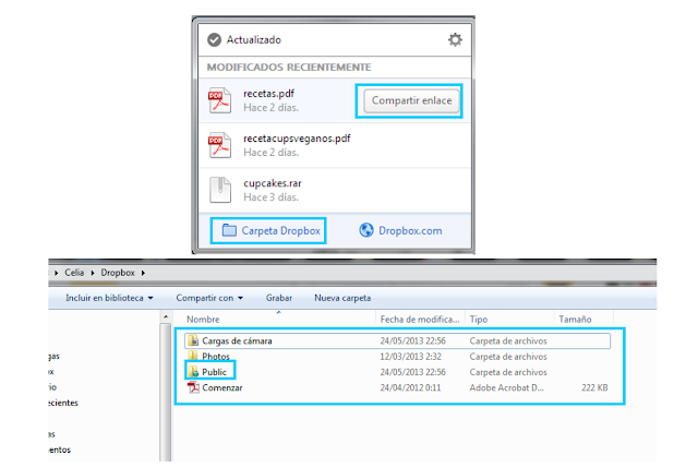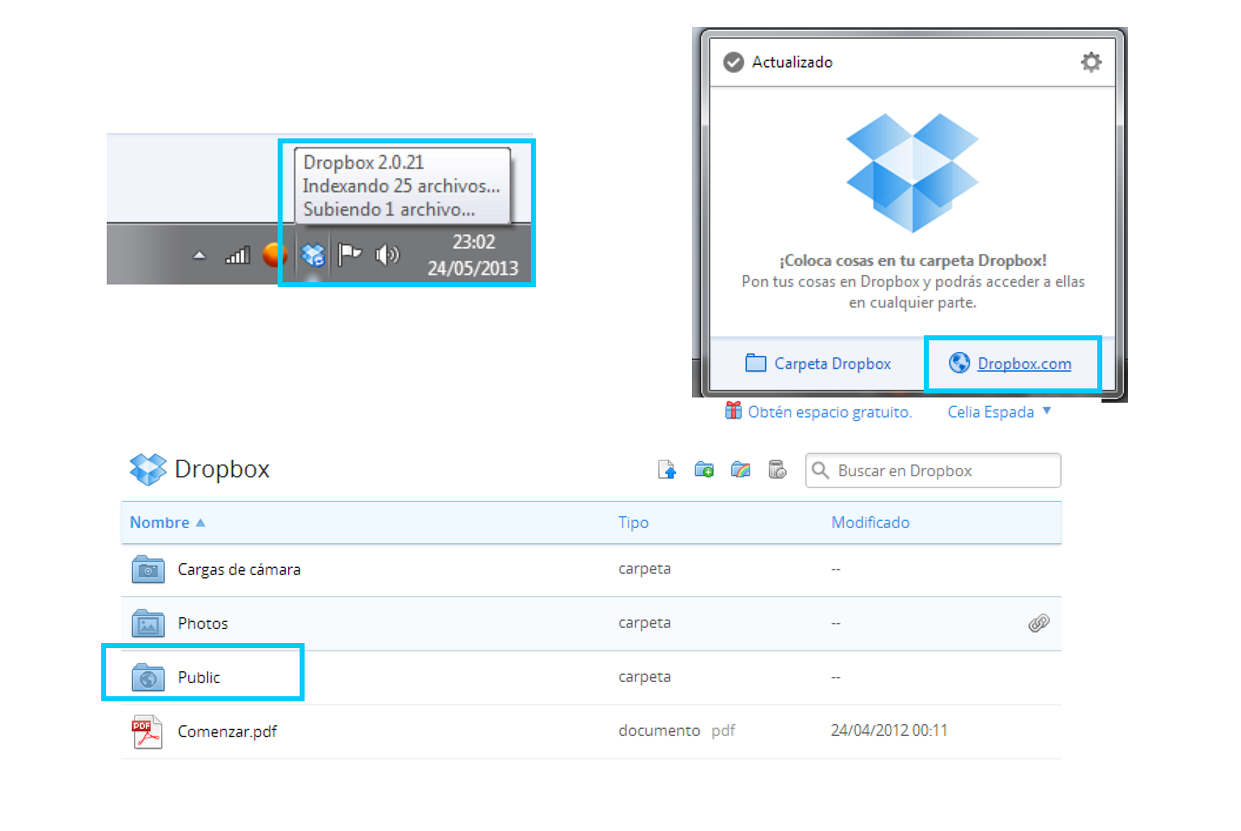 Iréis automáticamente a la carpeta de Dropbox de vuestro ordenador. Para subir fotos o archivos, tenéis que pegarlas en la carpeta Public.
