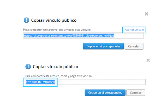 Pero, además, podemos usarlo para nuestro blog. Hay widgets de Blogger que, para personalizarlos, nos piden una URL, pues Dropbox nos ofrece esa url, incluso se puede acortar directamente desde nuestro panel sin tener que usar ningún otro programa adicional para ello.