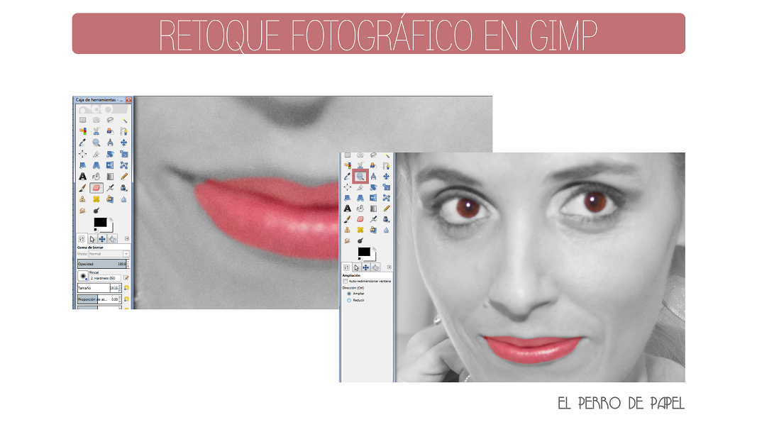 Seleccionamos la goma de borrar del menú de la derecha, ampliamos el zoom y en la capa de blanco y negro empezamos a borrar, despacio, la parte que queramos que tenga el color original de la fotografía. Si os equivocáis, podéis retroceder con la combinación de teclas: Ctrl + Z