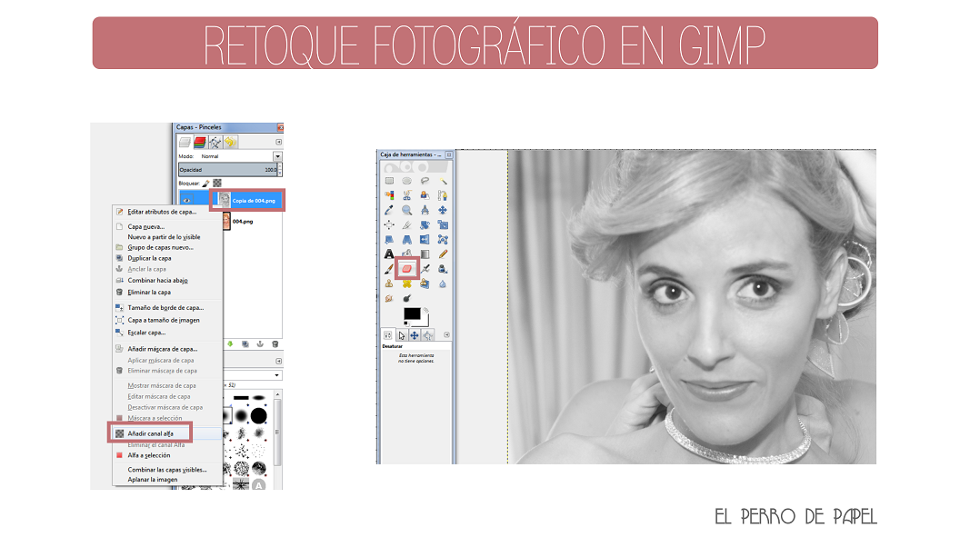 4.- El siguiente paso es añadir un "canal alfa" a nuestra nueva capa en blanco y negro. Pinchamos encima de la capa con el botón derecho del ratón y seleccionamos añadir canal alfa. Esto sirve para activar las transparencias en la fotografía.