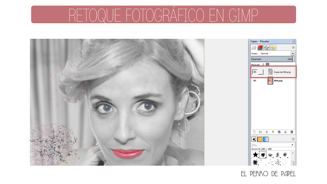 1.- Seleccionamos en el menú de la derecha la capa de la fotografía original. Y vamos a aplicarle colores usando la herramienta pincel. Tened en cuenta que solo se verá este efecto en las zonas borradas anteriormente, es decir, en las zonas a color de nuestra fotografía en blanco y negro.