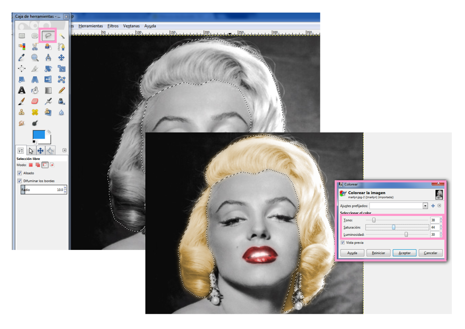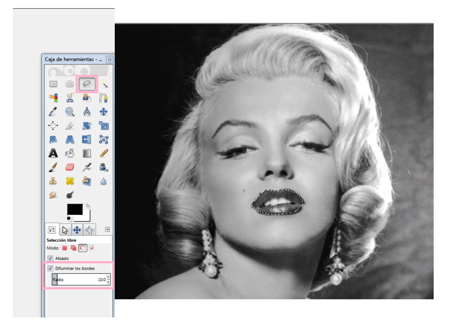 Como veis, se nos han coloreado también los dientes de Marilyn, así que vamos a eliminar el color y darles una leve luminosidad. Los seleccionamos con la herramienta lazo magnético.