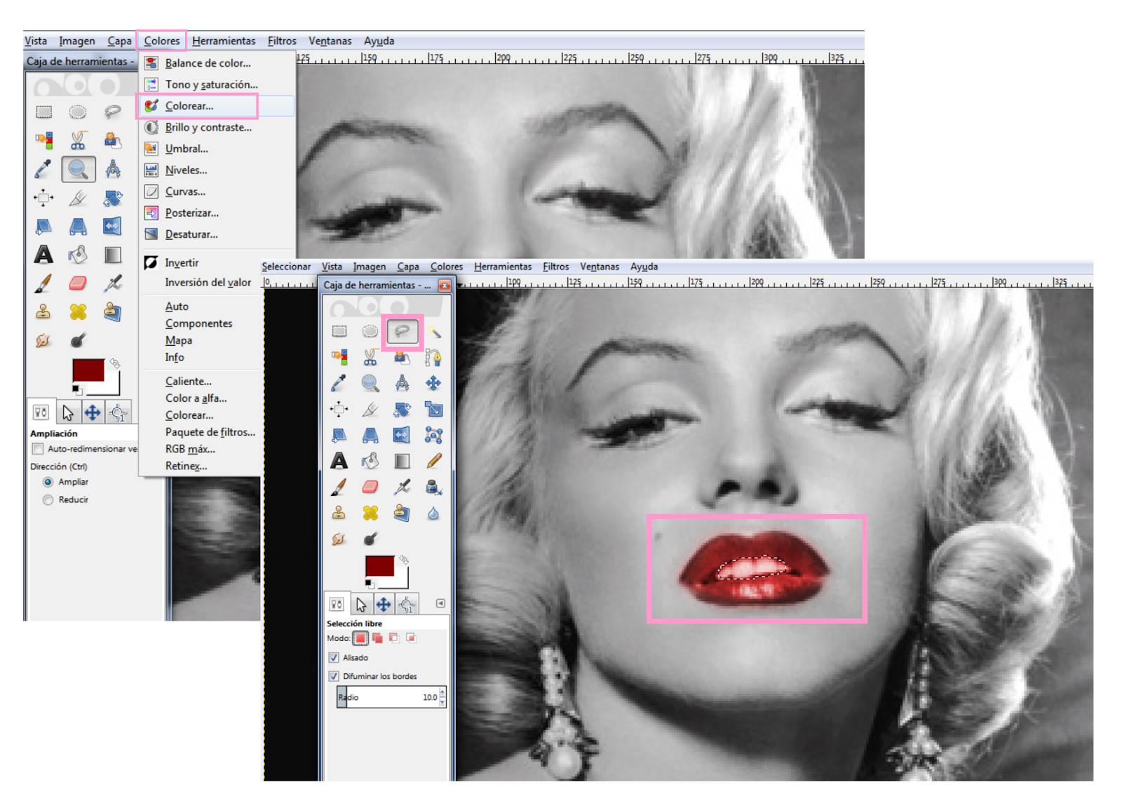 7.- Vamos a sacar los ojos, las cejas y los labios de nuestra selección. Para ello, con la herramienta lazo activa y la parte a colorear ya seleccionada, elegimos la tercera opción del panel desplegable de selección libre que os he marcado en rosa. Y dibujamos el contorno de las cejas, los ojos y la boca de Marilyn.