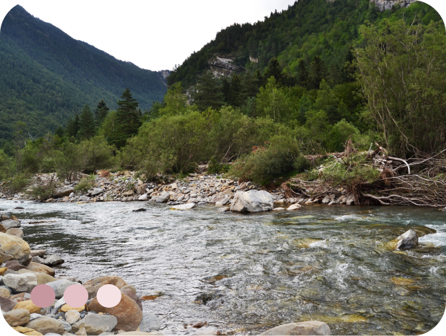 Valle del Bujaruelo, pasando Torla. Unos paisajes increíbles. A orillas del río Ara, con su agua helada, el tiempo parece detenerse. A lo lejos, en el horizonte, los Pirineos, con restos de nieve en la cumbre.