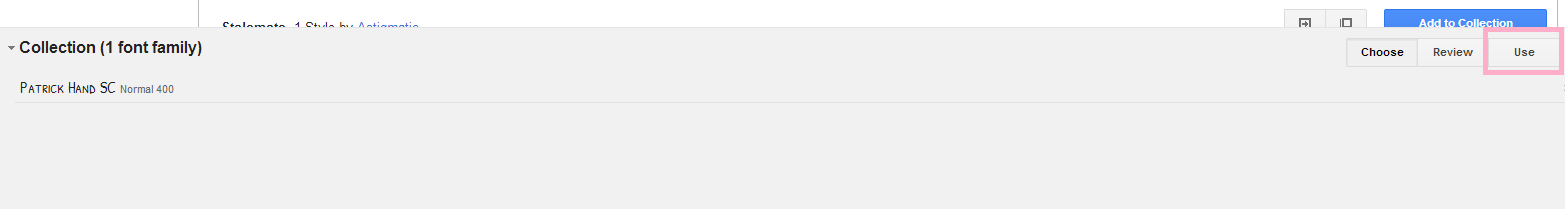 8.- Abajo nos aparecerá una pestaña gris llamada Collection con el número de fuentes que tenemos guardadas. Para empezar con la instalación en Blogger pinchamos en Use, a la derecha.