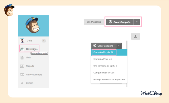 1.- Entramos en nuestra cuenta de MailChimp, en Campañas y seleccionamos Crear Campaña.