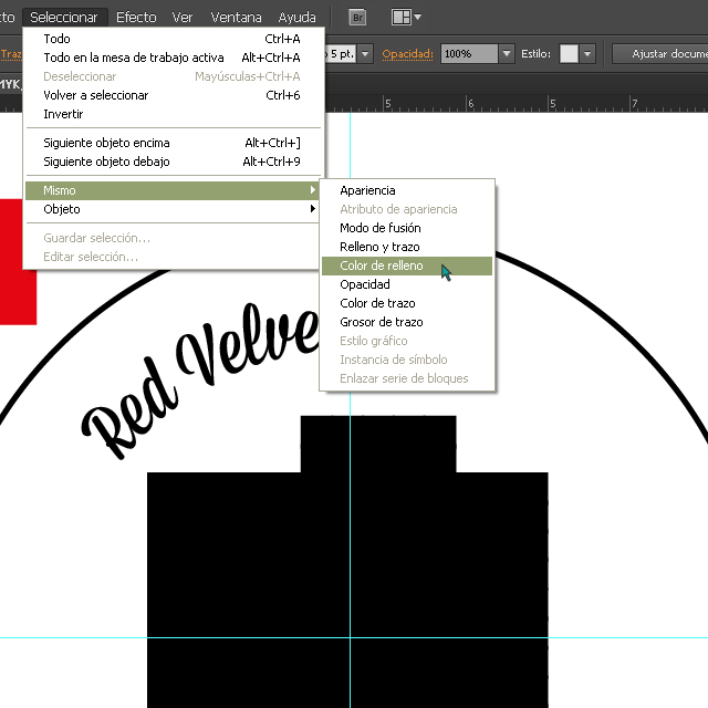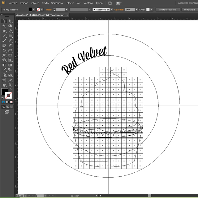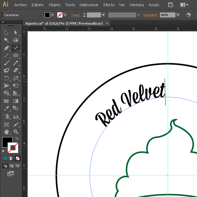 9. El círculo concéntrico es nuestra guía para el texto. Yo he elegido varios nombres para identificar los cupcakes y que cada persona sepa de qué sabor es el que se va a comer. Para el ejemplo he escogido “Red Velvet”, Cappuccino” y “Banana Split”. Tenemos que seleccionar la herramienta Texto en trazado.