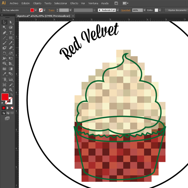Ya podemos decir que tenemos el esquema básico de nuestro diseño, ahora solo nos falta añadir el color, pero antes tenemos que “pixelar” el cupcake. Todos los diseños que hago para Pixelados siguen una misma línea, cuadraditos pequeños coloreados que parecen pixeles.