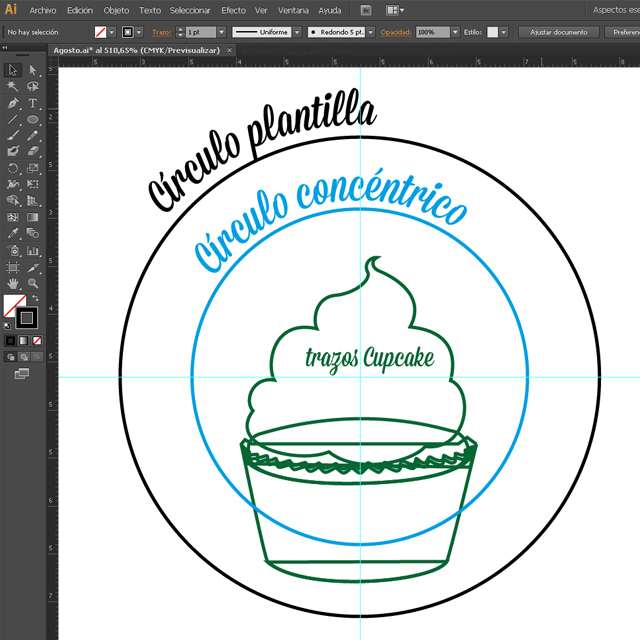 8. Cuando tengamos el dibujo del cupcake lo que vamos a hacer es un círculo concéntrico más pequeño (3,5 cm) dentro del que hemos hecho antes. Podemos usar unas guías para saber dónde está el centro de nuestro anterior círculo o usar el comando Ctrl + Y , que nos muestra el esquema del diseño (entonces podremos ver la “x” que muestra el centro del círculo y alinear a él el nuevo círculo más pequeño).
