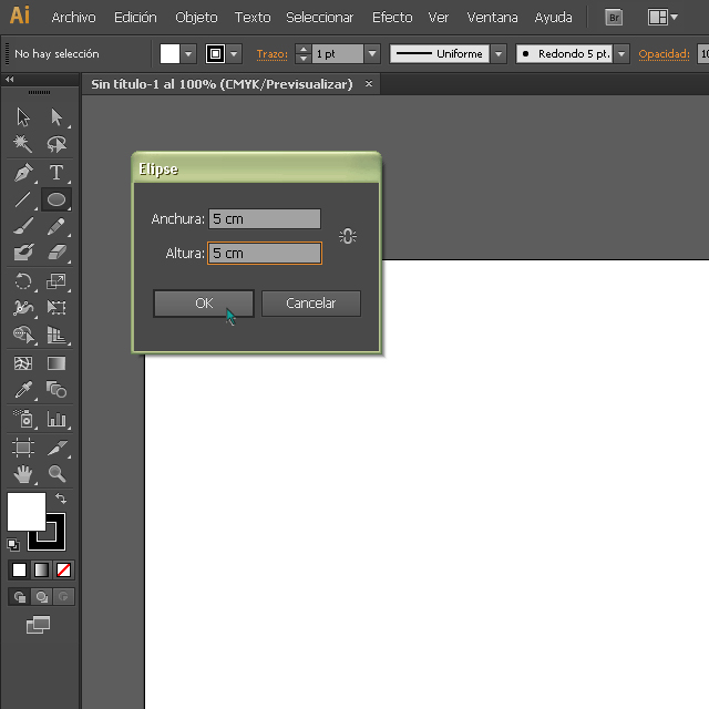 5. Hacemos clic sobre el área de trabajo para que nos aparezca la ventana Elipse. Ponemos 5 cm en los 2 valores y le damos a OK.