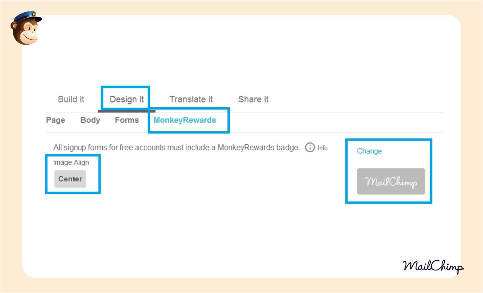 17.- Y, por último: MonkeyRewards --> la insignia de MailChimp que aparece al final de los formularios. Podemos elegir el alineado de la misma respecto a nuestro formulario (Image Align) y elegir entre los diferentes modelos disponibles el que mejor se adapte a nuestra idea (Change).