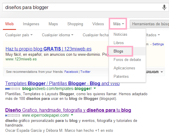 Además, si queremos saber que BLOGS hay ya posicionados sobre este tema, podemos reducir los resultados en la pestaña Más --> Blogs.