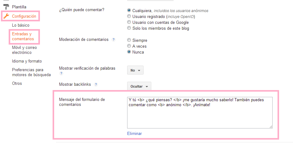 Ruta: Configuración --> Entradas y Comentarios --> Mensaje del Formulario de Comentarios.