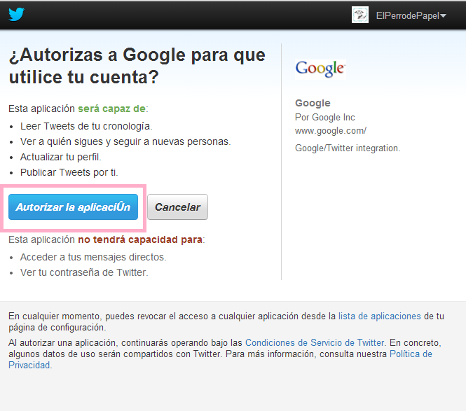5.- Seremos redirigidos en una nueva página a nuestra cuenta de Twitter para autorizar el acceso de la aplicación.