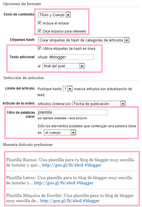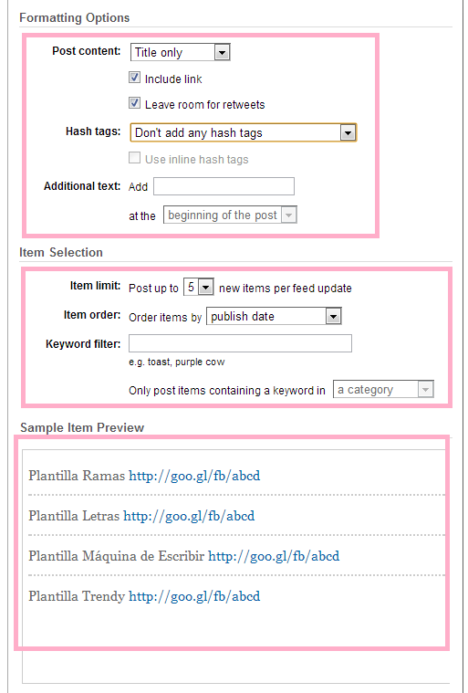 6.- Una vez ambas cuentas estén conectadas, podemos configurar desde la página de feedburner como queremos que se muestren nuestros tweets.