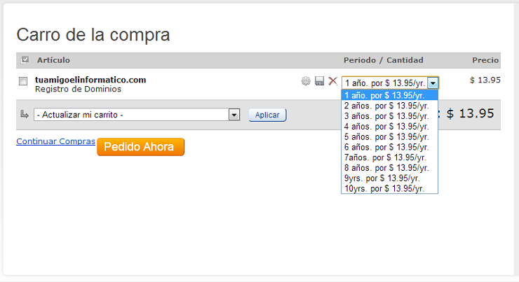 3.- Seleccionamos durante cuantos años queremos tener la propiedad de ese dominio y seleccionamos Pedido Ahora (botón amarillo de abajo a la izquierda)